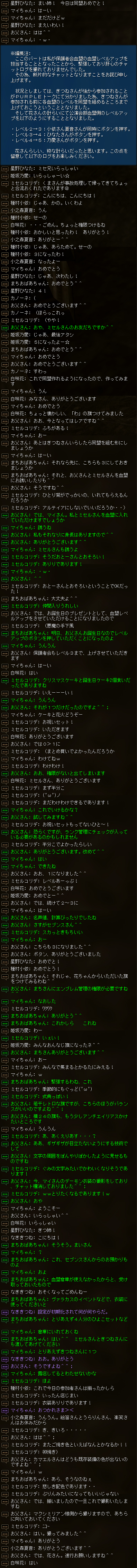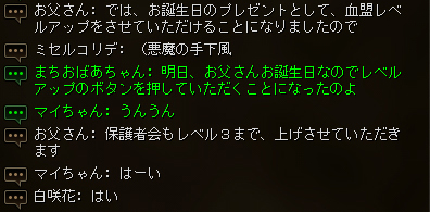 事前に千代りんさんから花さんに、「誕生日プレゼントとして血盟レベルアップボタンをDOSANさんに押してもらいたい」とお話があったようで、緊張しながらも大役を務めさせていただきました。