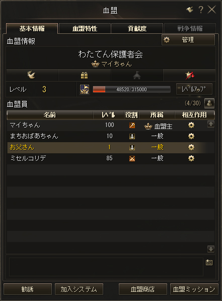 公演会部の血盟レベルを5に上げられるだけの名声値と、保護者会の血盟レベルを3に上げられるだけの名声値を稼ぎ終わったセブンスさんたちは、狩りで得たすべてのトレードできるアイテム(アデナ・素材)を「保護者会血盟の血盟倉庫に入れてほしい」と申し出られ、まちおばあさんに託してヴァラカスサーバを後にしたのでした。今後、ヴァラカスサーバでのイベントにアデナを使用することがある場合に使ってほしいという祈りが込められています。