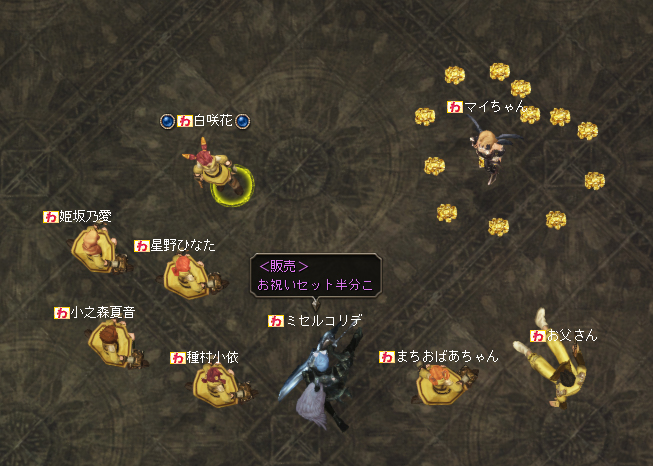 セブンスさんがヴァラカスにて活動した際、拾い集めたイベントアイテムなどをギランで露店販売してくださったのが松本香子さんでした。セブンスさんたちの狩りにアデナを使っていただく為に露店をしてくださったのですが、セブンスさんたちは支給エーレ装備かつ消耗品を使わないことから一切アデナを使うことはありませんでした。