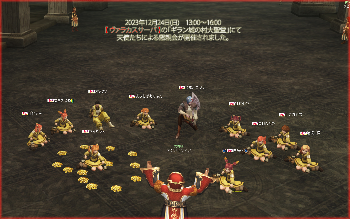 ※場所がギラン大聖堂でしたので、白チャットではご迷惑になる可能性がありましたので最初の方は血盟チャットの代わりとしてパーティーチャットで会話をしたり、途中で場所を移す算段をしておりました。