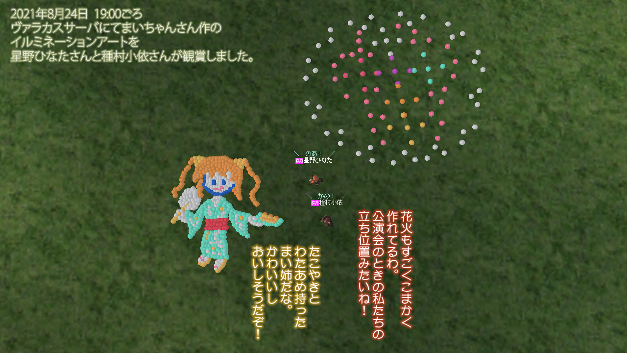 ヒナタちゃんがフォローしてくれてうれしかった>ω< それで、お話はみんなが作ってくれたものそのままでほとんどダイジョウブだったから、その台本を使ったリハーサルと、花火のイベントのリハーサルそれぞれで時間を計ってみて収まるかどうかテストしたんだよー。