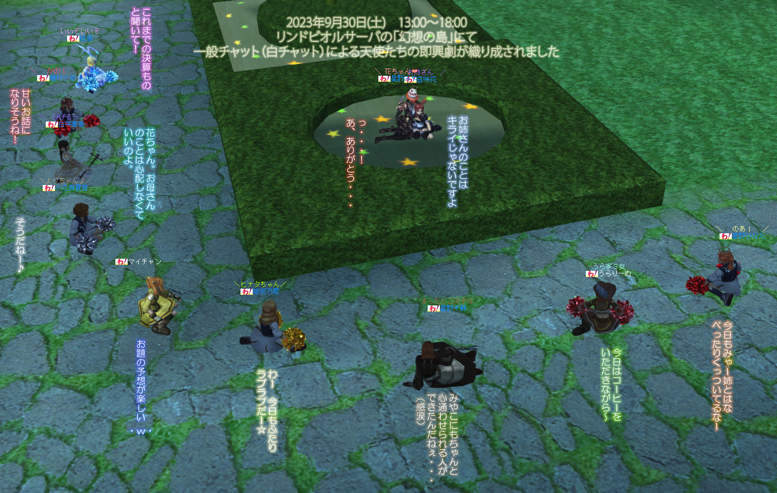 今回も主に「天使たちのお友だち(保護者さま)」を対象とした即興劇を、人数制限のない一般チャット(白チャット)にて天使たちが実施してくださいました。