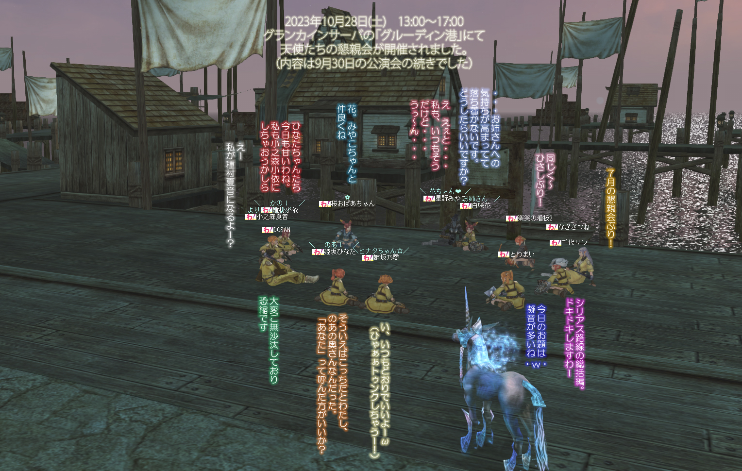 スクリーンショットは白咲花さんとDOSANが撮影したものになります。(懇親会の為、公演会部側の血盟チャットによる相談・打ち合わせはなかったとのこと。種村小依さんいつも公演会側のチャットログ撮影ありがとうございます)