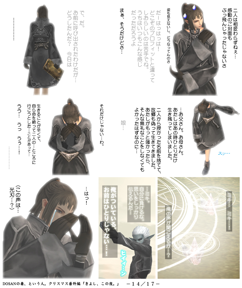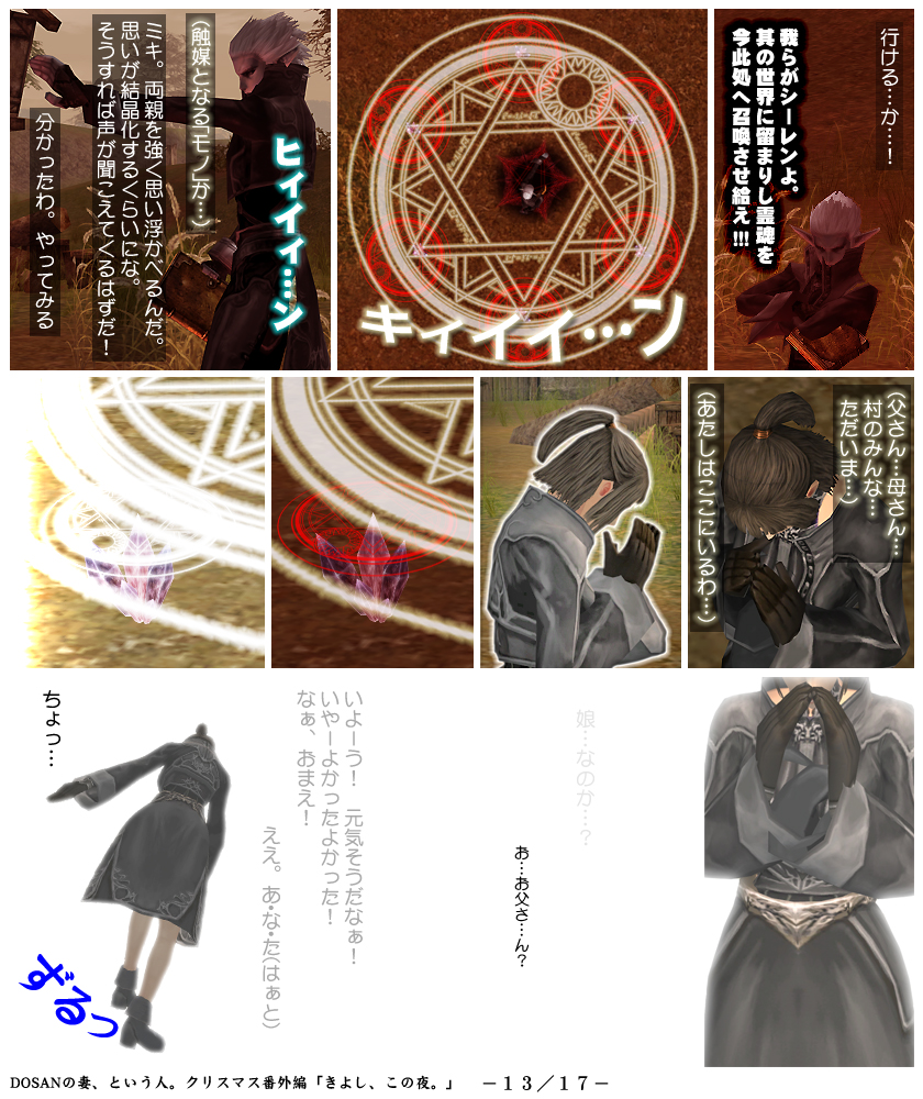 補足ですが、ミコさんによる「召喚魔法」のベースとなっているのは「アルティザンの魂」というクエストです。リネージュ2の設定上、死が身近なものであるダークエルフ専用のクエストで、故人の想いを確認する為のものだったと記憶しています。