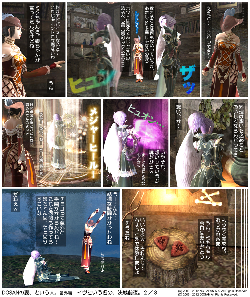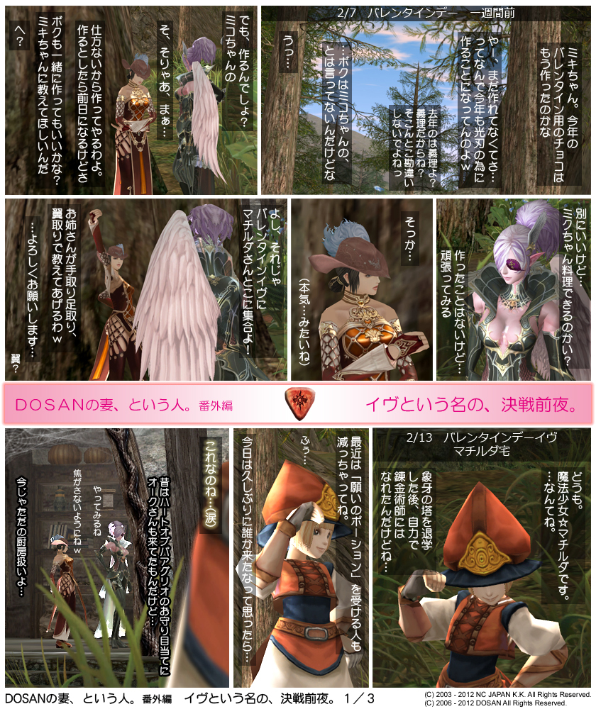 作中にチョコレートとして登場する「紅い封印石」ですが、これは2011年11月の破滅の女神アップデートによりゲーム内から消滅してしまったアイテムのひとつです。赤い色と少しだけハートに近い形をしていることから小道具として使いましたが、もう今後の物語では使うことができなくなってしまいました。
