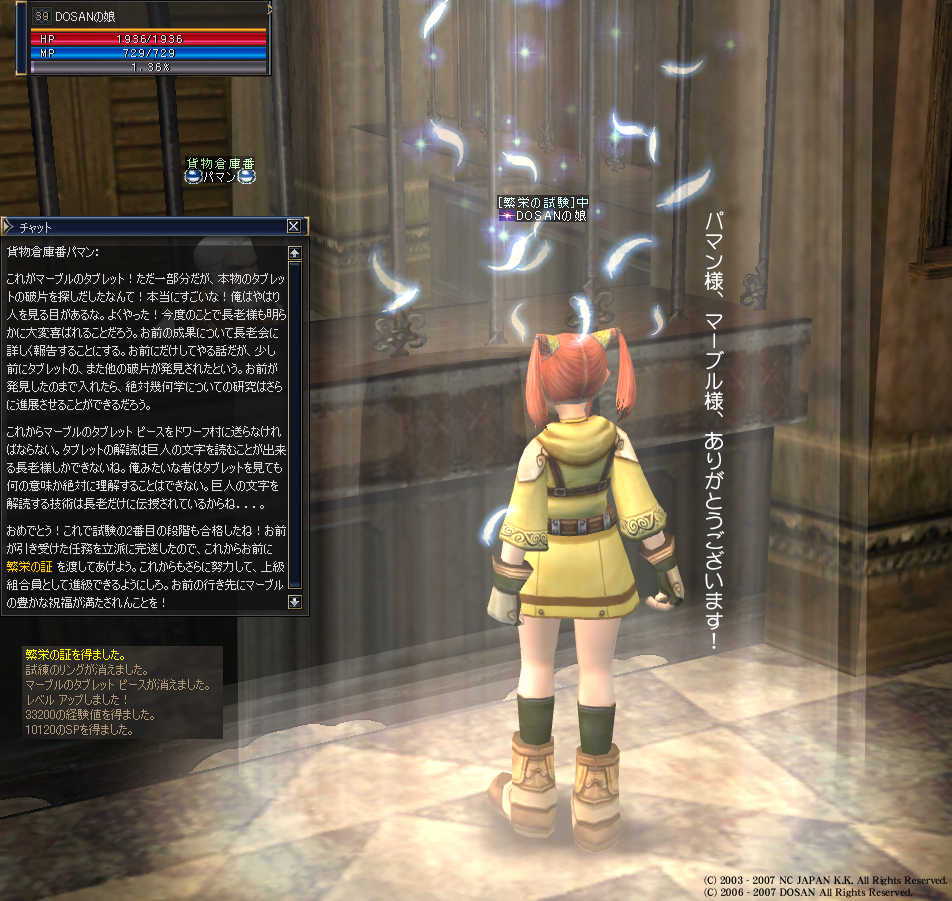 二次転職クエストの第二段階(繁栄の試験)をクリアした際の娘のカットです。
