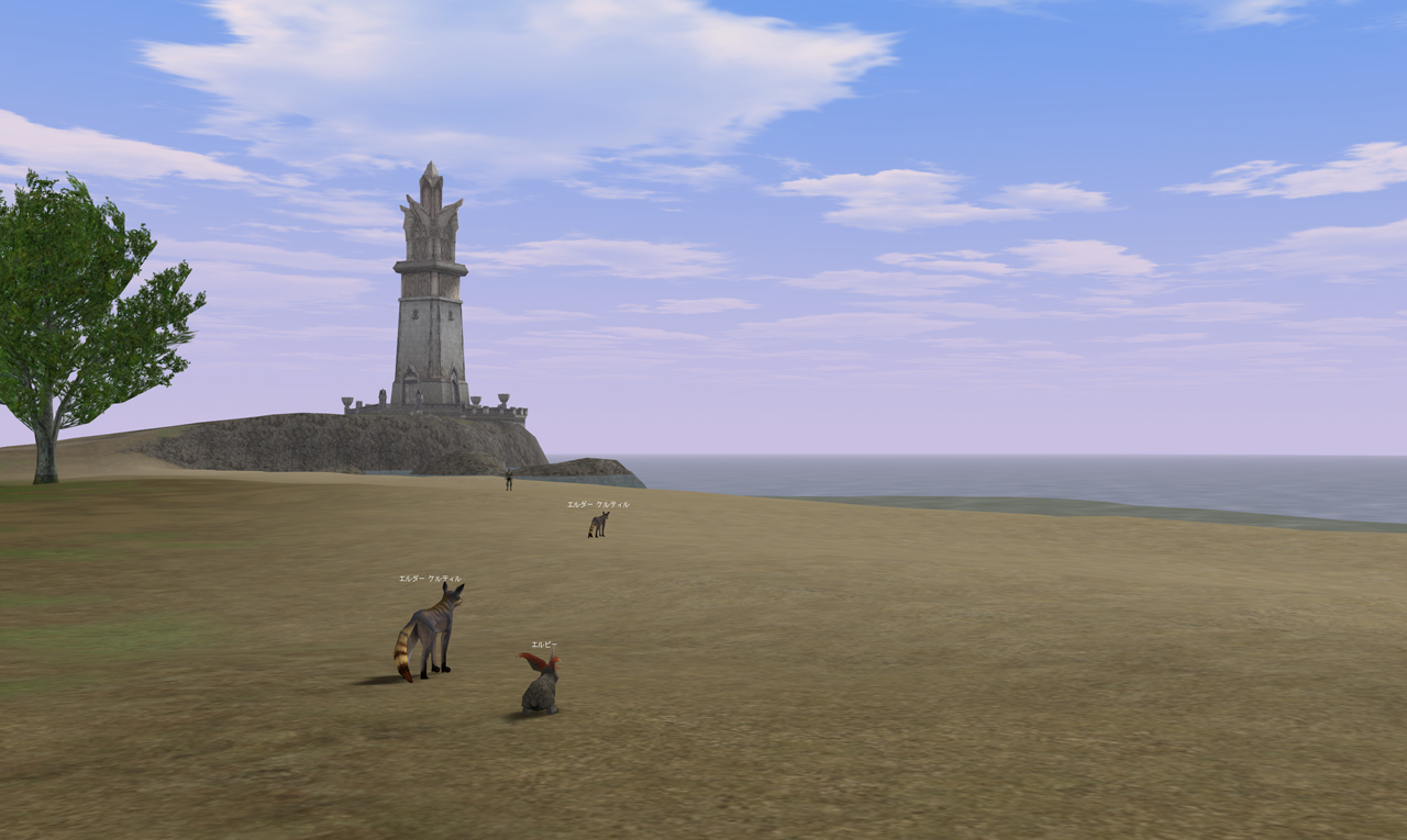村のすぐ外では、ケルティルとエルピーが仲良くしてます。遠くに灯台も見えますね。